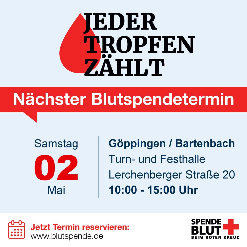 Auch dieses Jahr machen wir zusammen mit dem Deutschen Roten Kreuz wieder eine Blutspendenaktion in der Turn- und Festhalle Bartenbach.